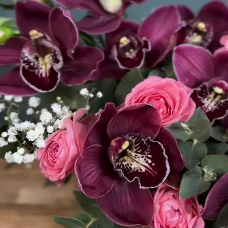 Композиция с орхидеей Цимбидиум, кустовыми розами и эвкалиптом