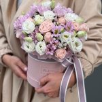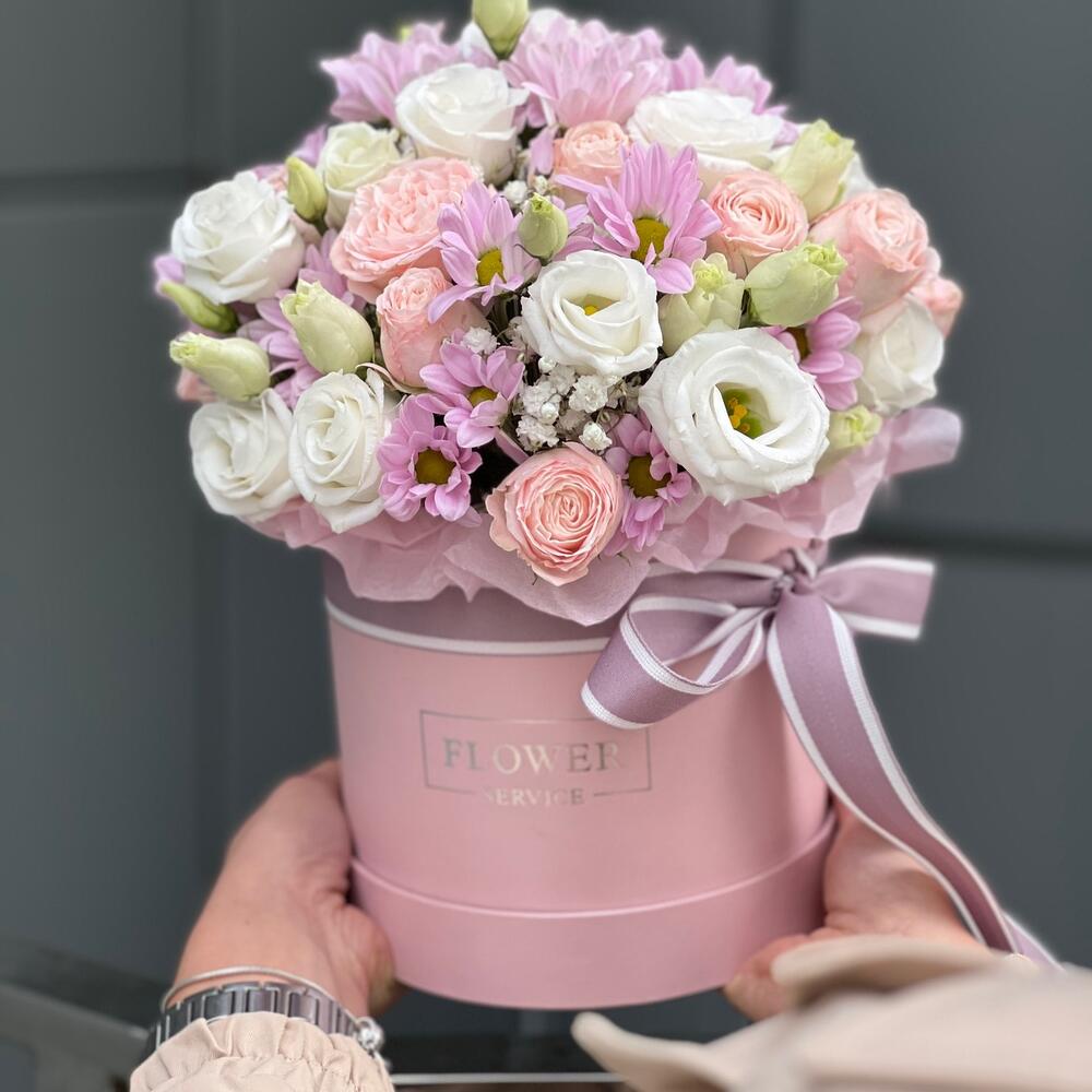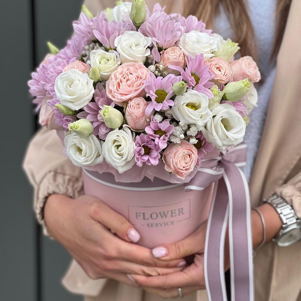 Коробка цветов из хризантемы, кустовой розы, эустомы и зелени!