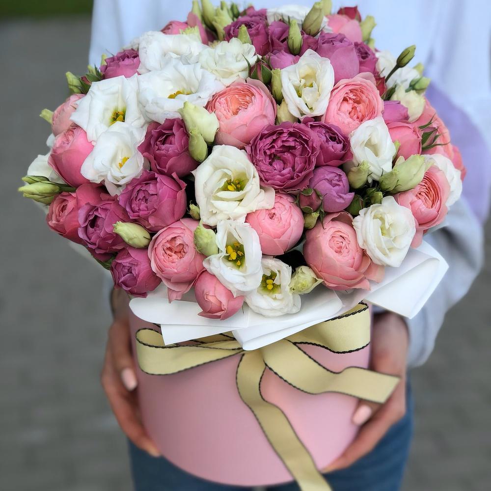 Эустома – 5 шт. Кустовая пионовидная роза – 15 шт. Писташ – 2 шт. Коробка – 1 шт. Оазис – 4 шт.