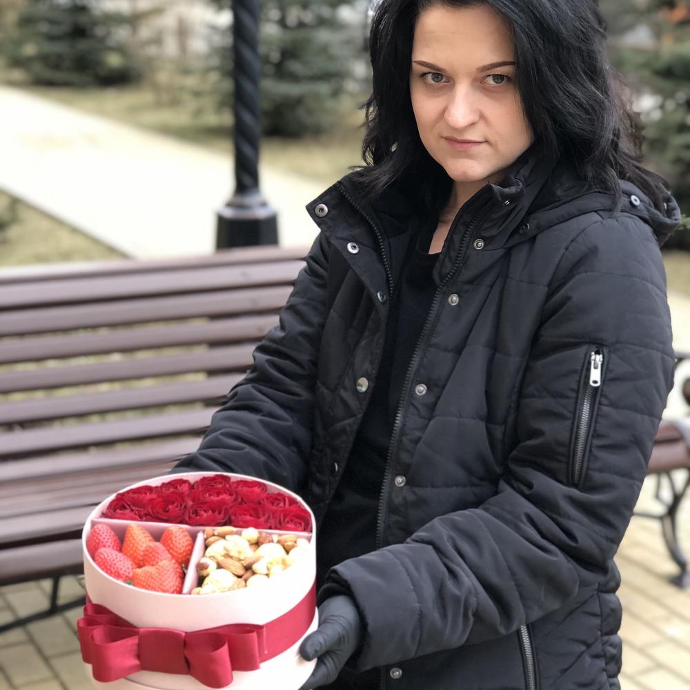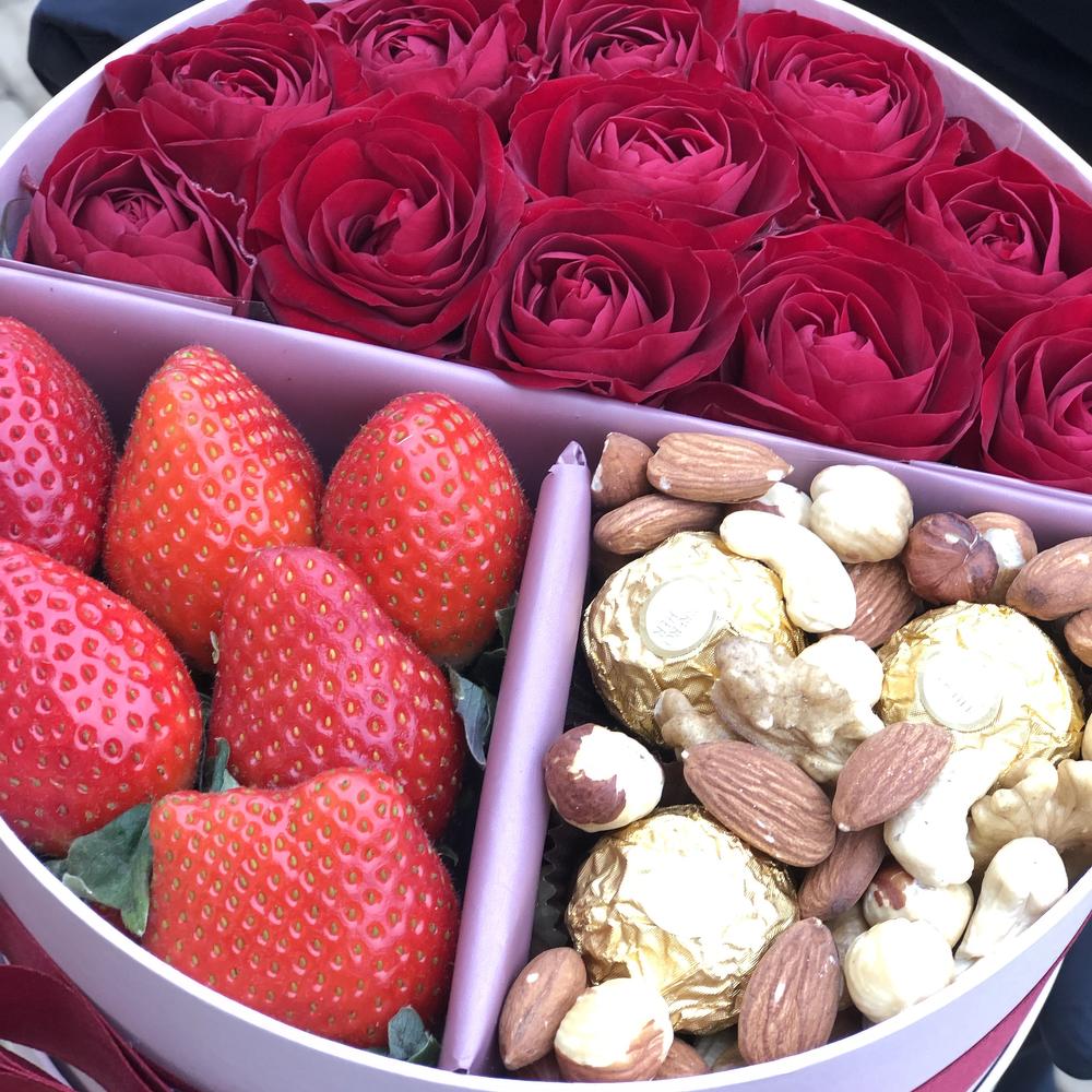 Коробка шляпная – 1 шт.Роза – 11 шт.Орехи – 200 гр.Конфеты – 4 шт.Клубника – 150 гр.