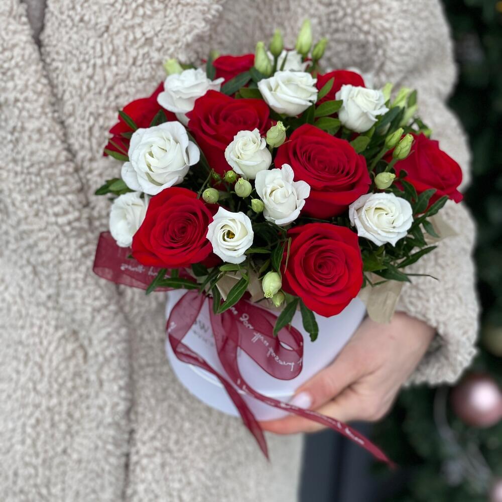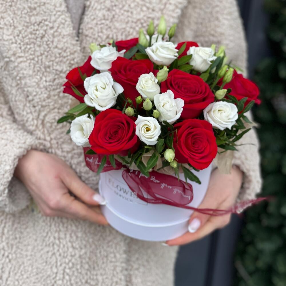 красная роза сорта фридом – 9 шт. эустома белая – 3 шт. Писташ – 2 шт. Оазис – 1 шт. Коробка – 1 шт.
