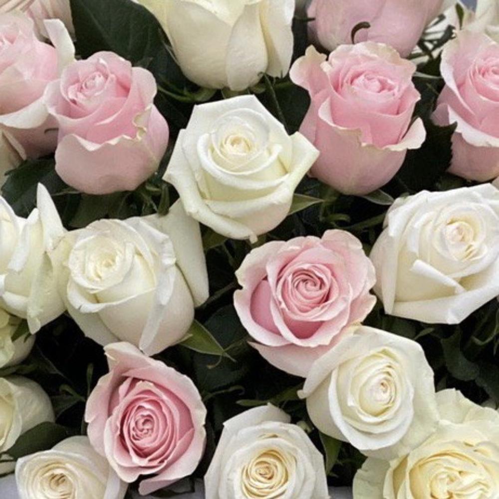 Роза белая мондиаль – 35 шт. роза розовая пинк мондиаль – 30 шт. Корзина – 1 шт. Оазис – 4 шт.