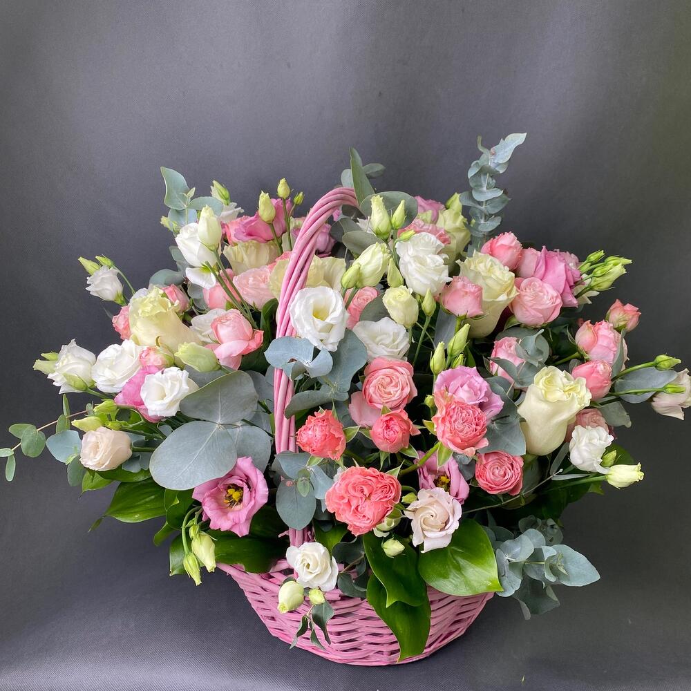 Корзина из пион роз и лизиантуса «Lady s»