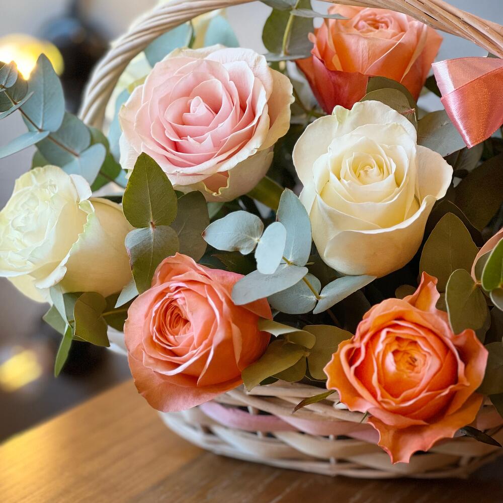 Эвкалипт – 7 шт.Лента атласная – 1 шт.Корзина плетеная – 1 шт.Оазис флористический – 1 шт.розы микс – 9 шт.работа флориста – 1 шт.