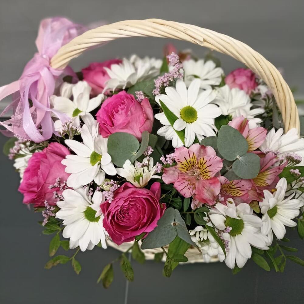 Корзина с пионовидными розами, хризантемами , альстромериями , лимониумом, эвкалиптом и фисташкой