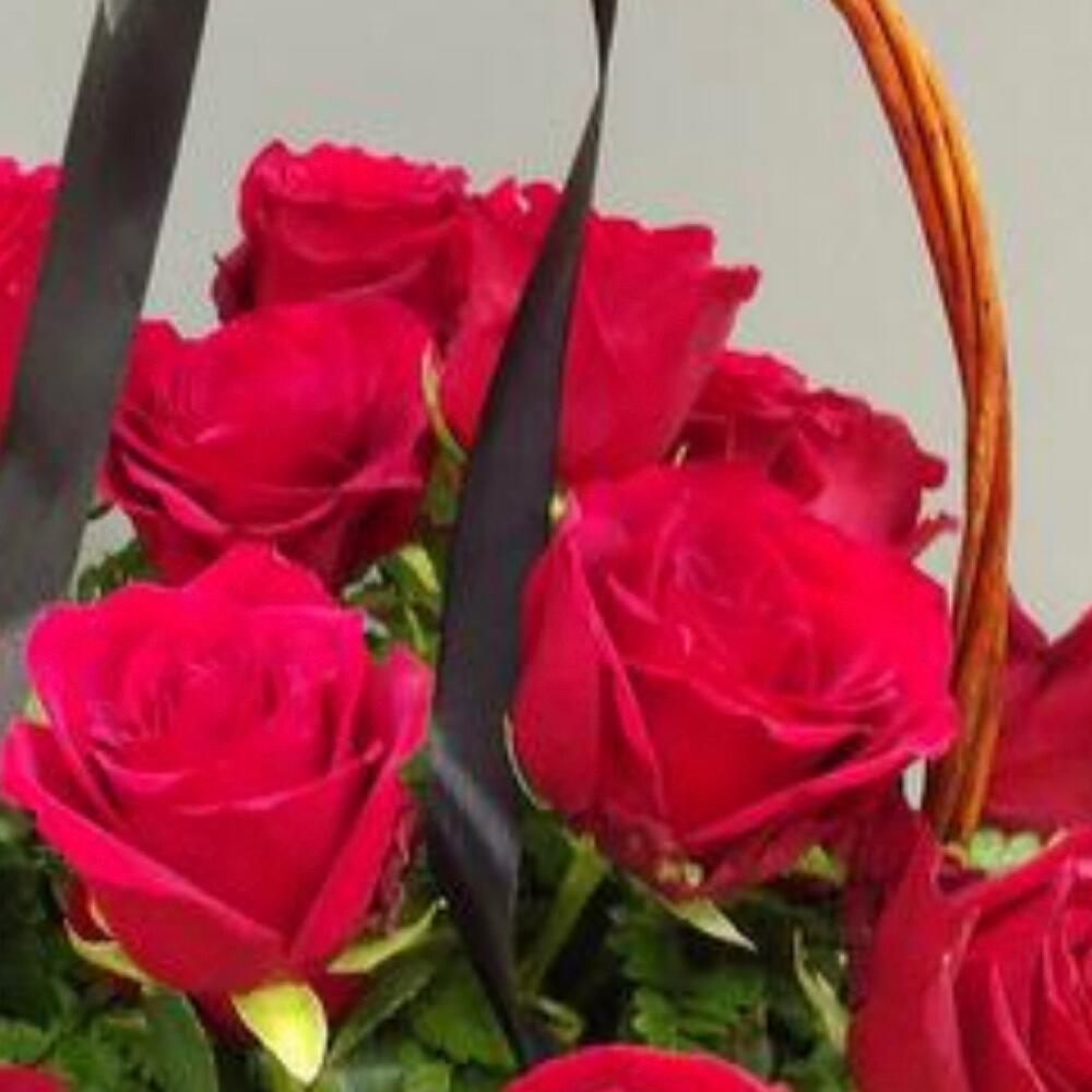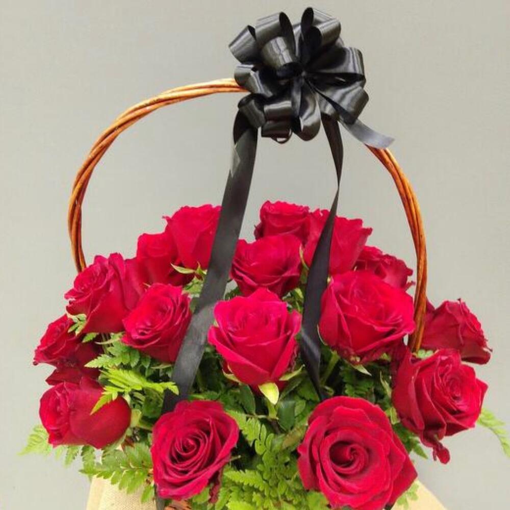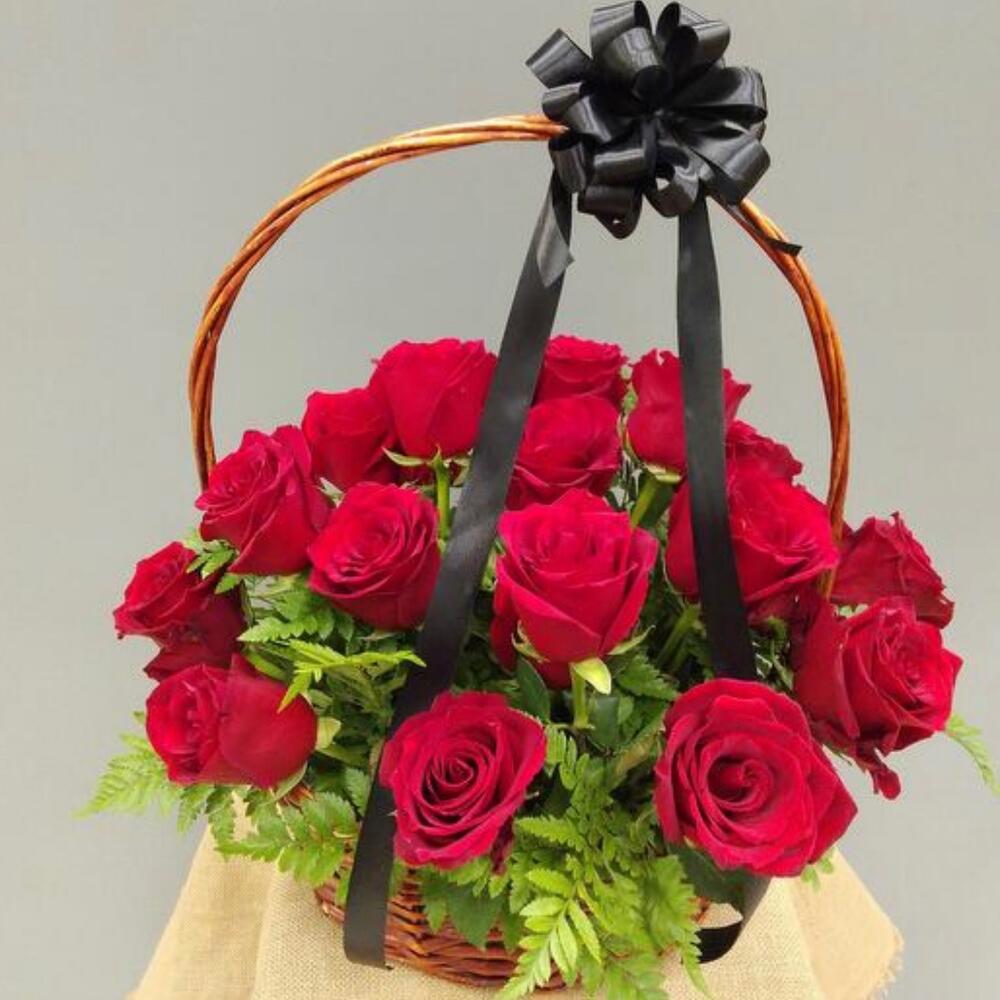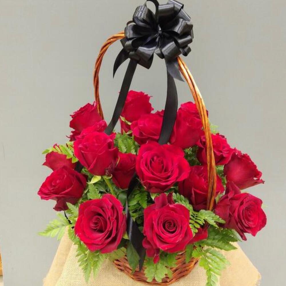 Роза красная 70 см – 22 шт.Зелень – 2 шт.Корзина плетеная – 1 шт.Оазис флористический – 2 шт.Лента атласная – 5 шт.