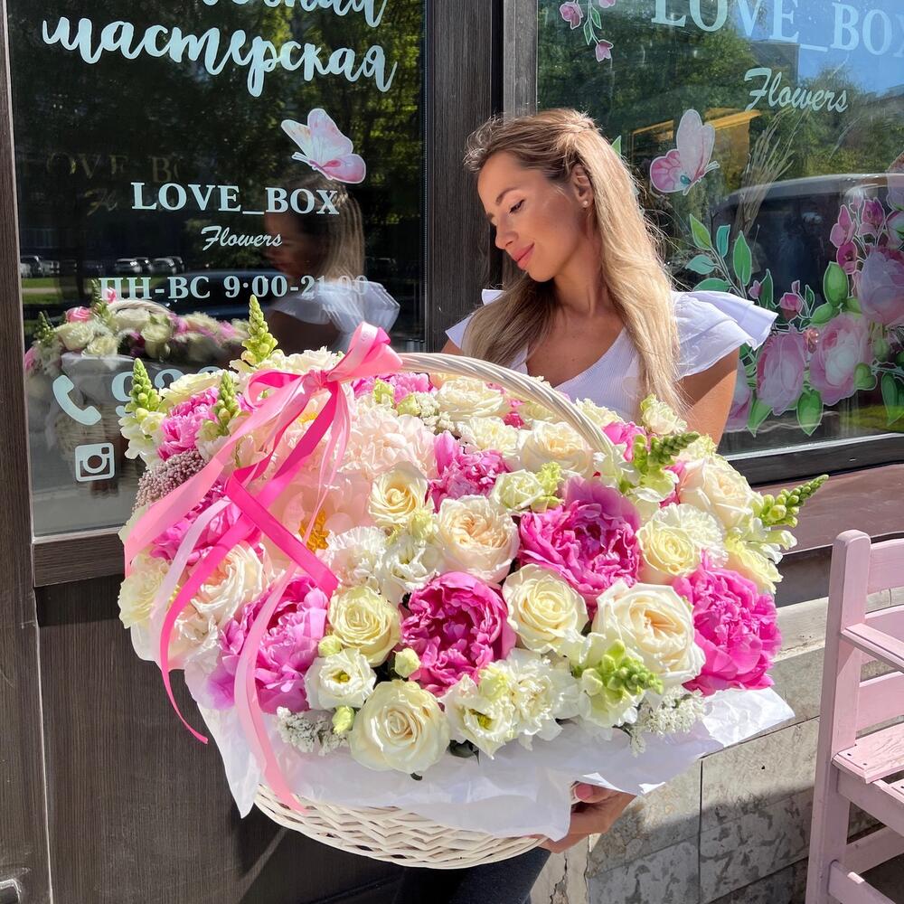 Пион – 10 шт.Лизиантус – 7 шт.Диантус – 8 шт.Роза Эквадор – 15 шт.Роза пионовидная – 6 шт.Корзина плетеная – 1 шт.Оазис флористический – 5 шт.Статица – 5 шт.