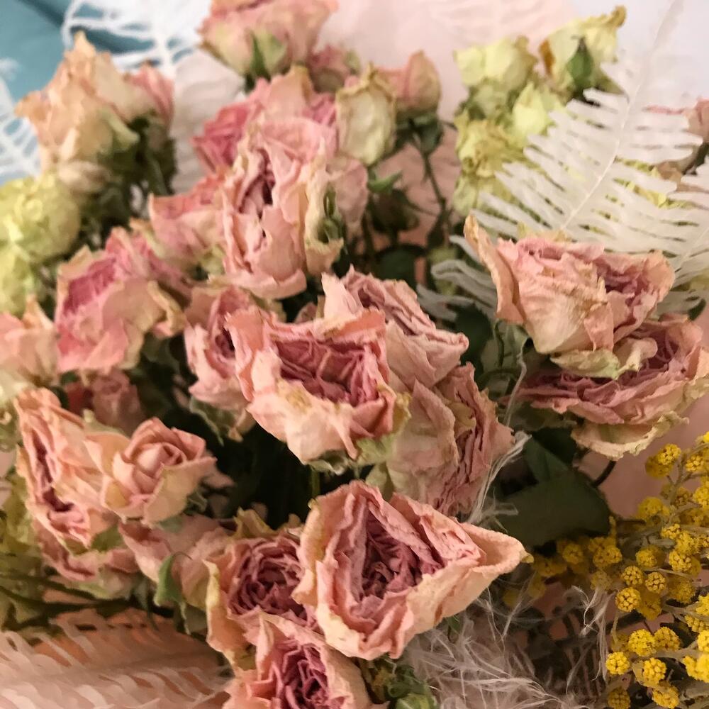 Крафт пакет – 1 шт.Оформление – 1 шт.Ковыль – 2 шт.стабилизированный аспарагус – 2 шт.засушенные розы – 11 шт.