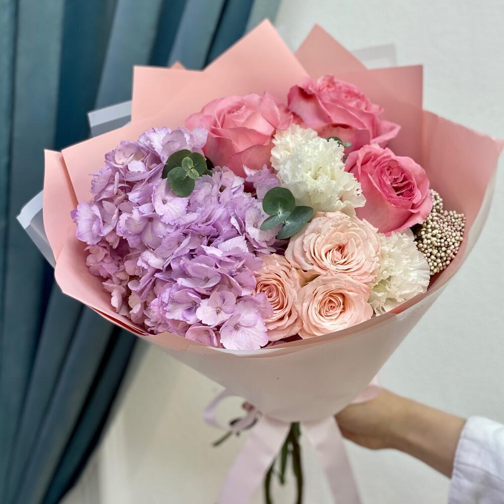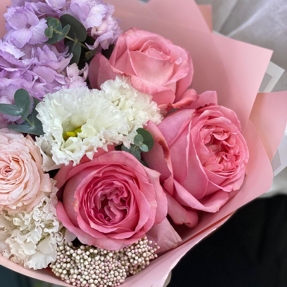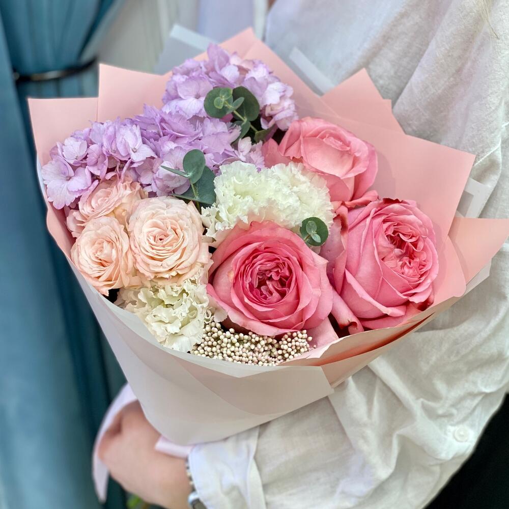 Красивый букет с гортензией и пионовидными розами