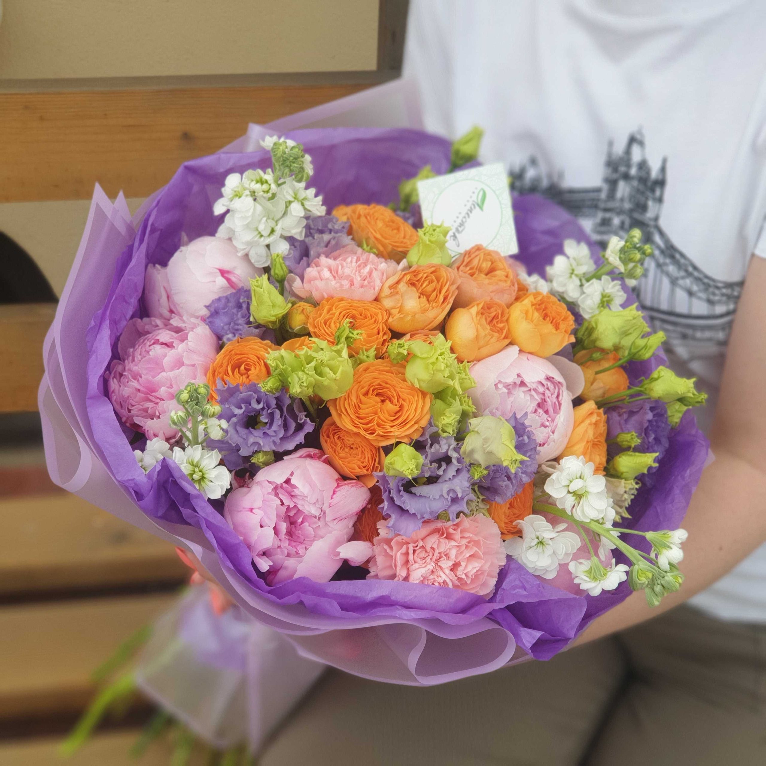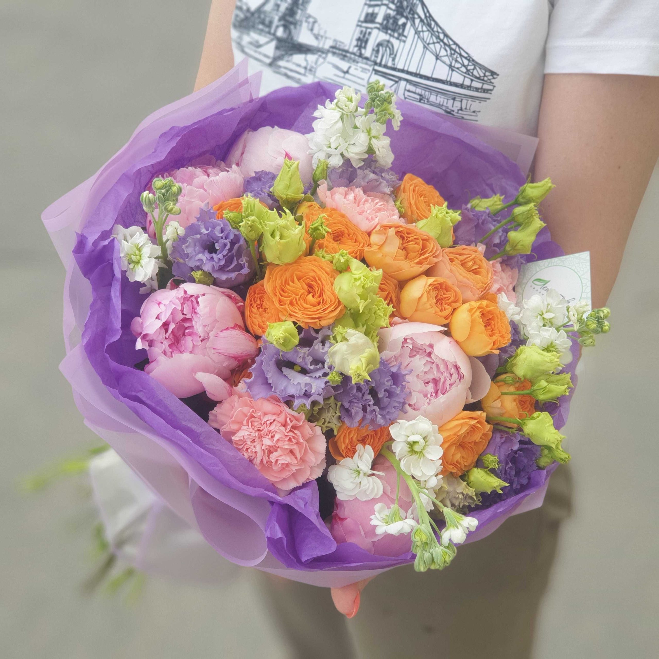 Букет из пионов, дельфиниума, твидий и лизиантусов
