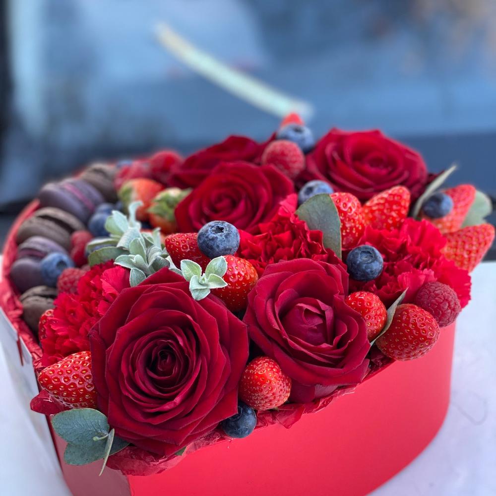 Сердце коробка – 1 шт.ягоды – 300 гр.Роза – 5 шт.Гвоздика – 3 шт.Зелень – 3 шт.