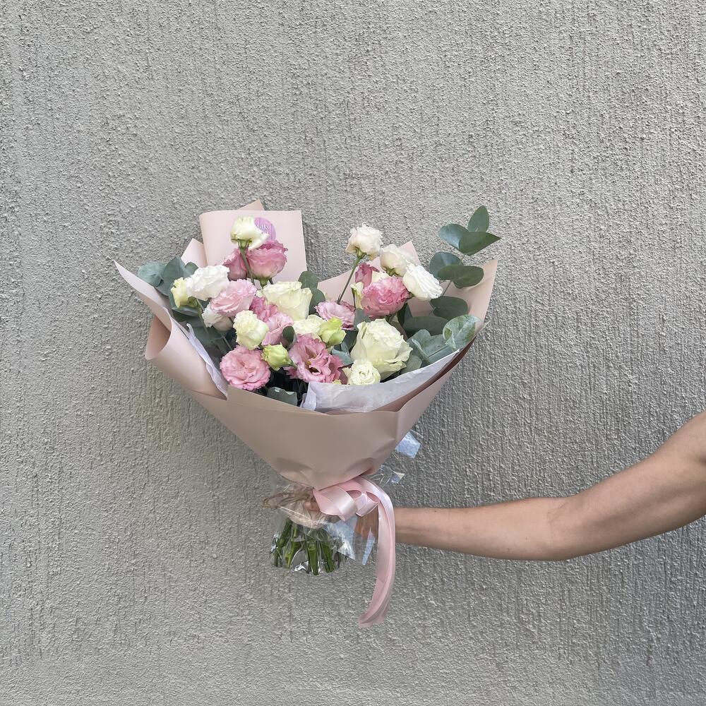 В этом букете сочетаются изящная эустома и нежная роза, что создает прекрасное сочетание цветов и текстур. Каждый цветок в букете подобран внимательно, только самые свежие и качественные цветы используются для создания этого букета.