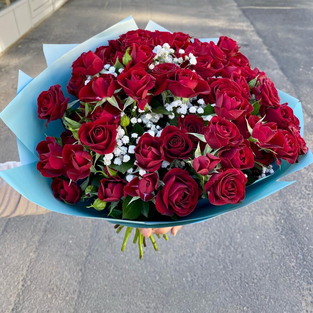 Роза кустовая – 19 шт.Гипсофила – 1 шт.Упаковка дизайнерская – 1 шт.Лента атласная – 1 шт.