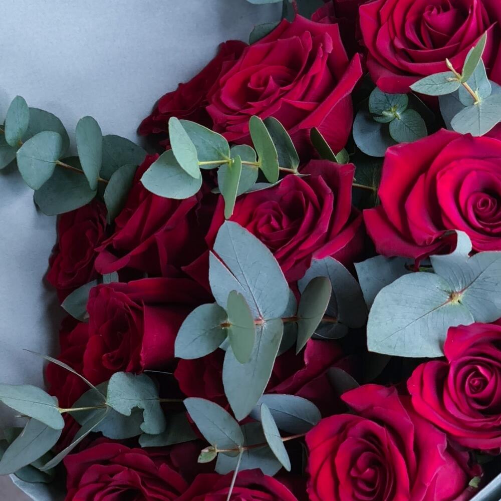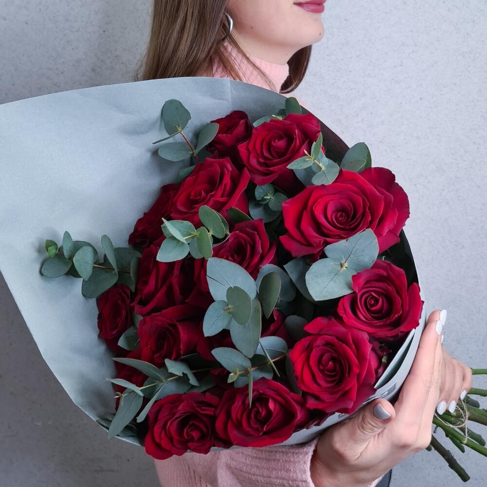 Монобукет из красных роз и эвкалипта