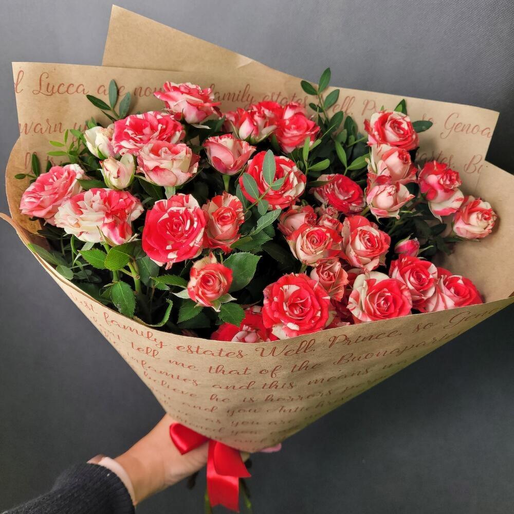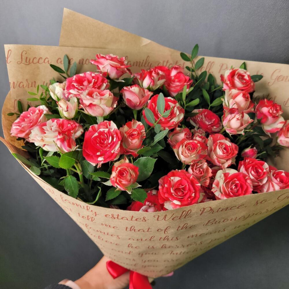 Роза кустовая – 5 шт.Лента атласная – 1 шт.Фисташка – 2 шт.Упаковка крафт – 1 шт.