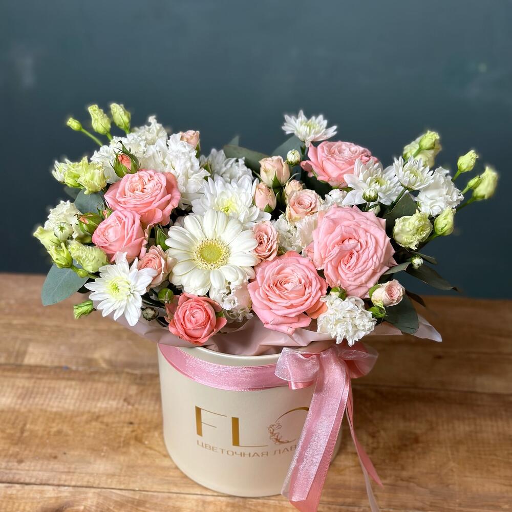 Лента – 2 шт.Гербера мини – 1 шт.Роза кустовая Голландия – 1 шт.Шляпная коробка – 1 шт.Эвкалипт цинерария – 1 шт.роза кустовая мадам бомбастик – 1 шт.мохровая хризантема кустовая – 1 шт.лизиантус мохровой (эустома) – 1 шт.
