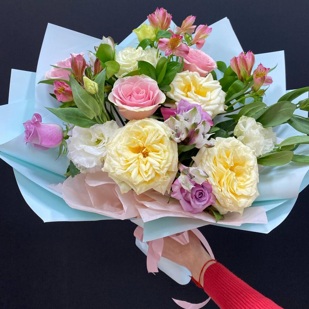 Роза садовая – 3 шт. Роза Кенийская – 3 шт. Роза Эквадор – 3 шт. Альстромерия – 5 шт. Рускус – 3 шт. Лизиантус – 3 шт. салфетка декоративная – 4 шт. Лента атласная – 4 шт. Тишью – 2 шт. Слюда упаковка – 4 шт.