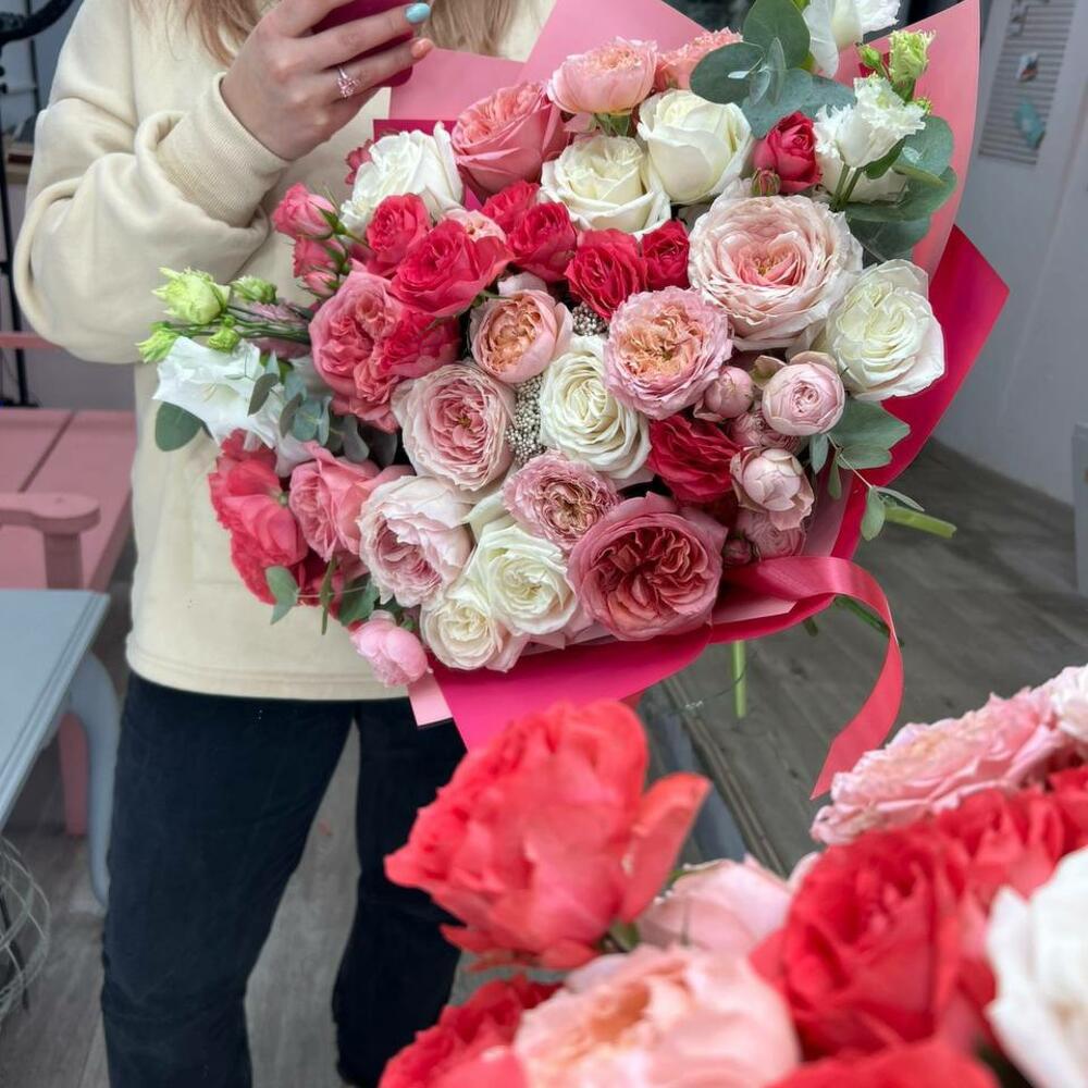 Лизиантус – 2 шт.Кустовая пионовидная роза – 3 шт.Пионовидная роза – 7 шт.Кризал – 1 шт.транспортировочный бокс – 1 шт.Аквапак – 1 шт.Кустовая малиновая роза – 3 шт.Кустовая роза – 2 шт.Садовая роза – 3 шт.Озотамнус – 1 шт.Эвкалипт – 1 шт.