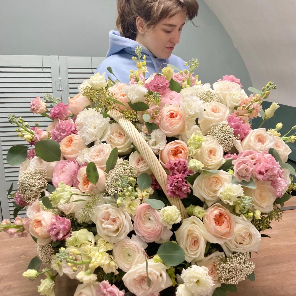 Зефирная - Корзина с пионовидными розами и маттиолой