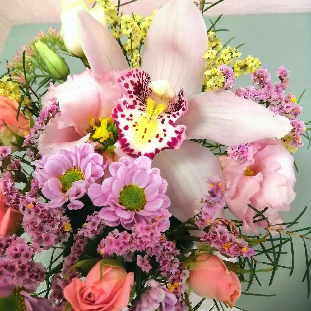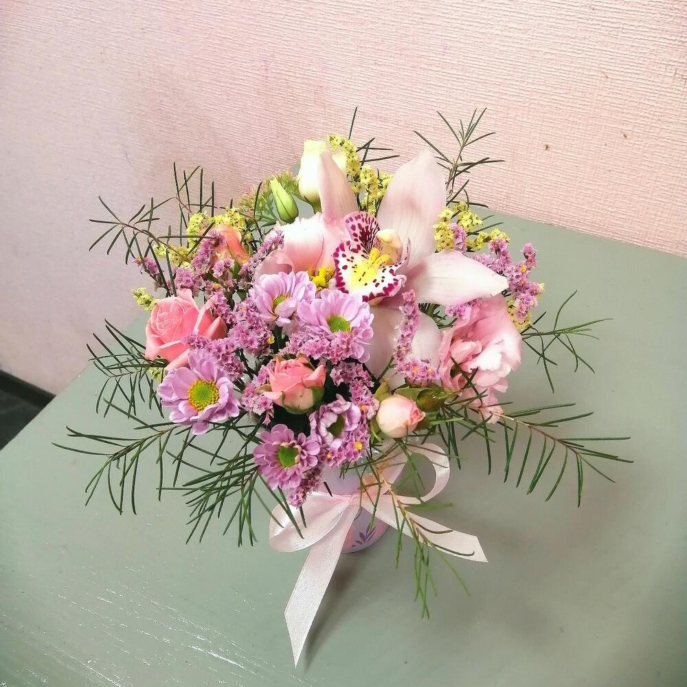 Роза кустовая – 1 шт.Лента атласная – 1 шт.Сантини – 1 шт.Орхидея цветок – 1 шт.Оазис флористический – 1 шт.зелень декоративная – 1 шт.Стакан декоративный – 1 шт.