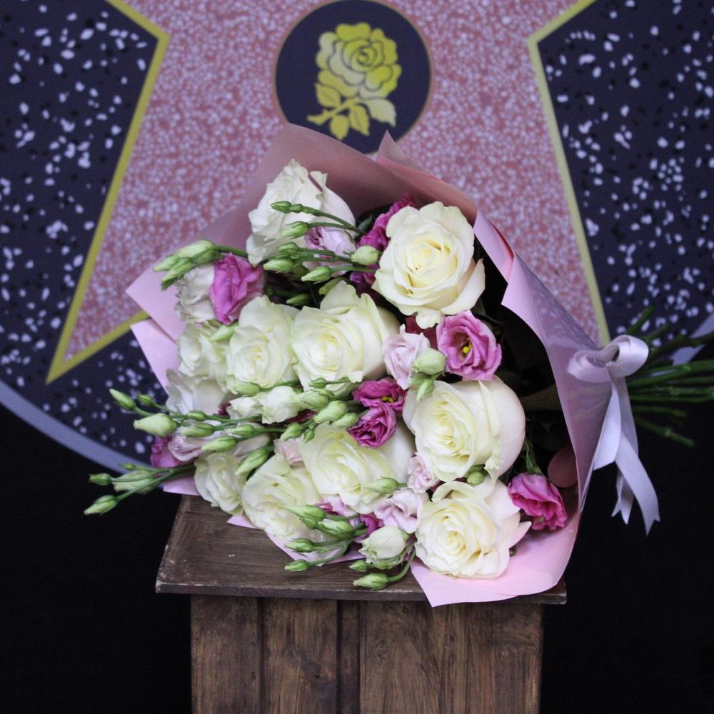 Роза премиум – 11 шт.Эустома – 7 шт.Пленка дизайнерская – 3 шт.Лента атласная – 2 шт.