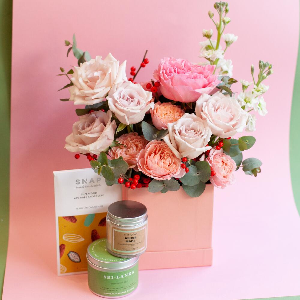 шоколад снап – 1 шт.аромасвеча для массажа смородина – 1 шт.аромасвеча интерьерная – 1 шт.Шляпная коробка – 1 шт.Пакет крафт – 1 шт.Пионовидная роза – 1 шт.Роза – 4 шт.Илекс – 2 шт.