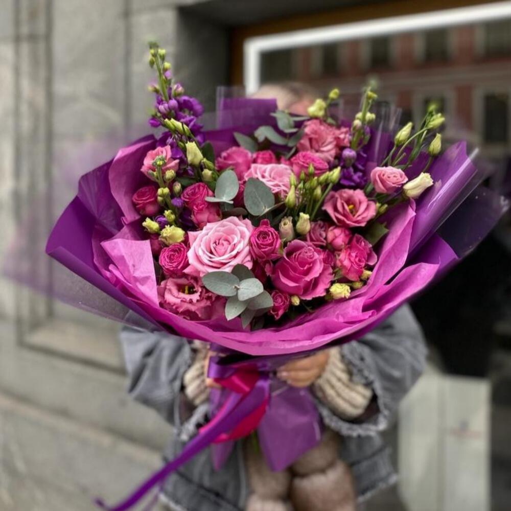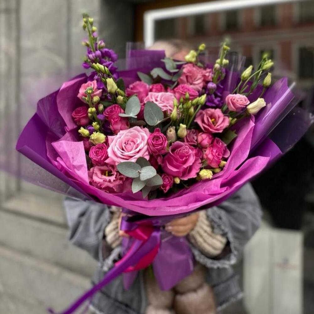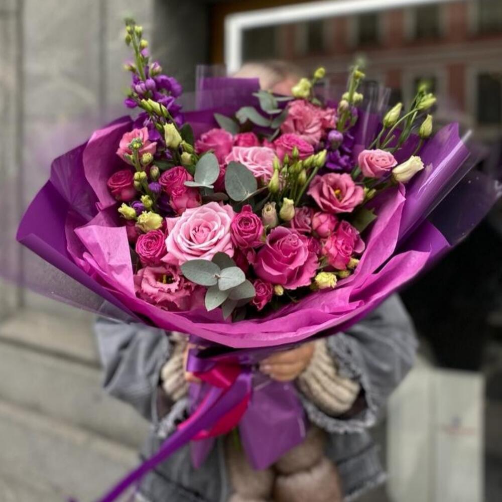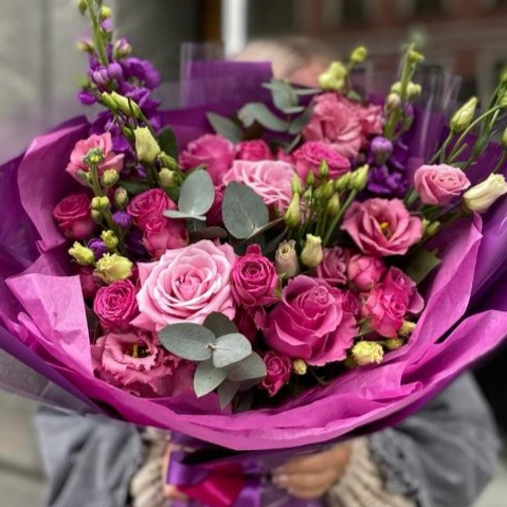 Маттиола – 3 шт.Роза одноголовая – 5 шт.эустома розовая – 2 шт.Кустовая малиновая роза – 3 шт.Эвкалипт – 2 шт.Дизайнерская упаковка – 1 шт.