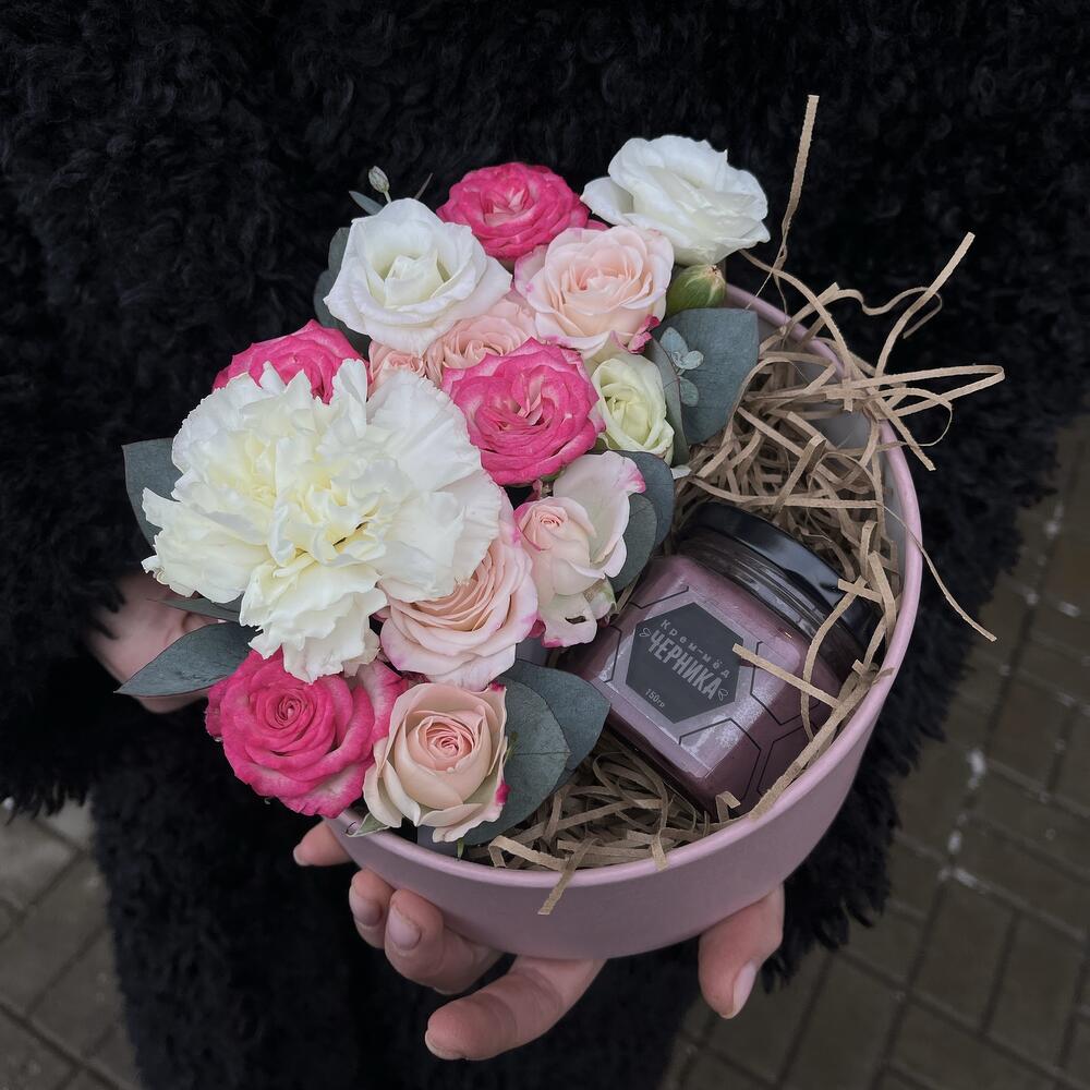 Романтичная коробочка со сладким крем-медом, кустовыми розами и диантусом.