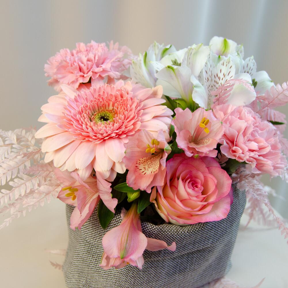 Альстромерия – 2 шт. Гвоздика – 2 шт. Гербера – 1 шт. Оазис – 1 шт. Фисташка – 2 шт. Мешочек – 1 шт. папоротник стабилизированный – 1 шт. Роза – 1 шт.
