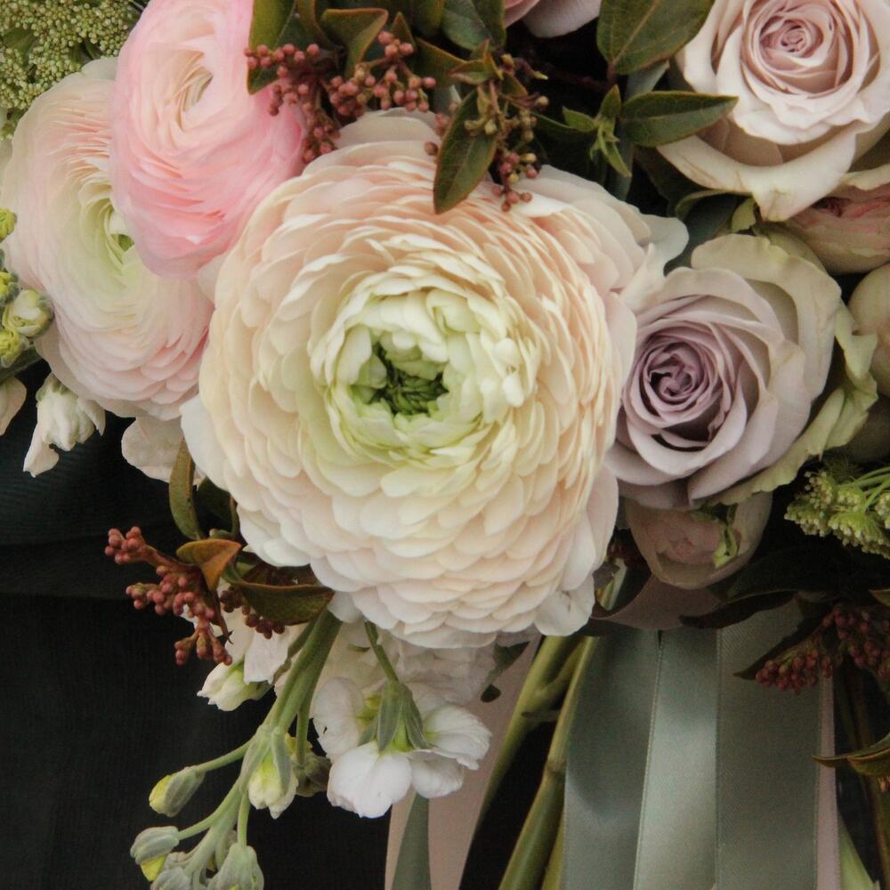 Садовый, авторский букет с ранункулюсами, пионовидными розами, амми, душистой маттиолой и эвкалиптом.