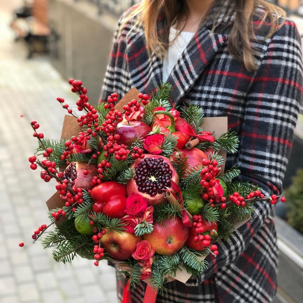 Съедобный зимний букет из гранатов, яблок, илекса, кустовых роз и нобилиса “Морозные ягоды”