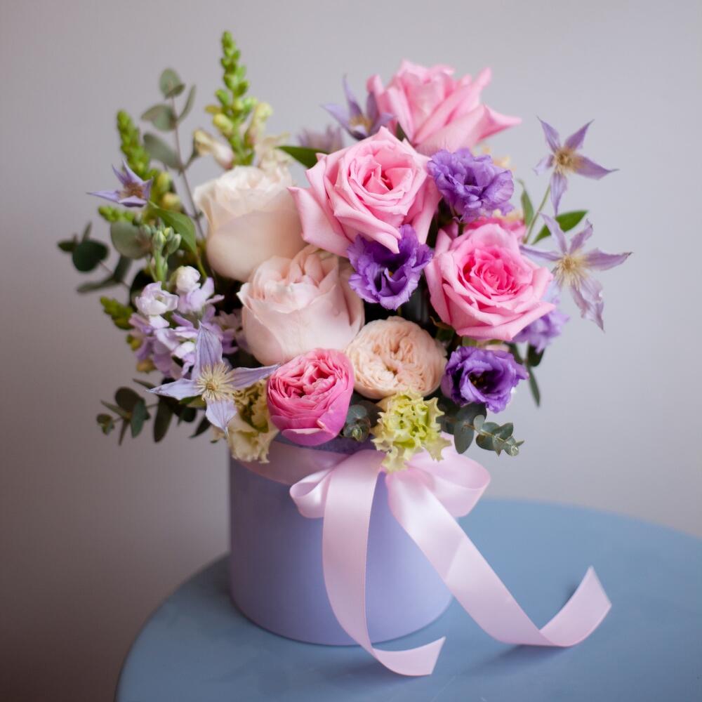 Шляпная коробка с цветами в сиренево- розовой гамме