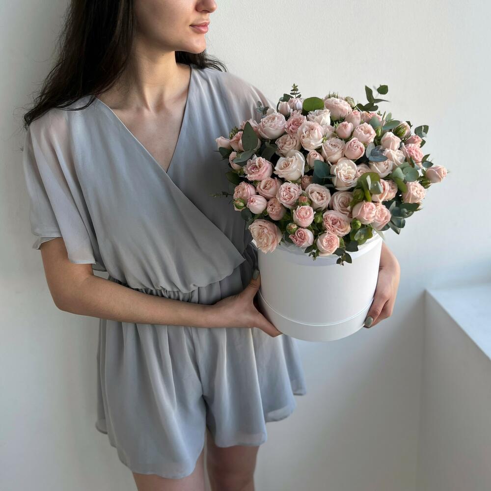 Кустовая роза – 19 шт.Эвкалипт – 4 шт.Шляпная коробка – 1 шт.