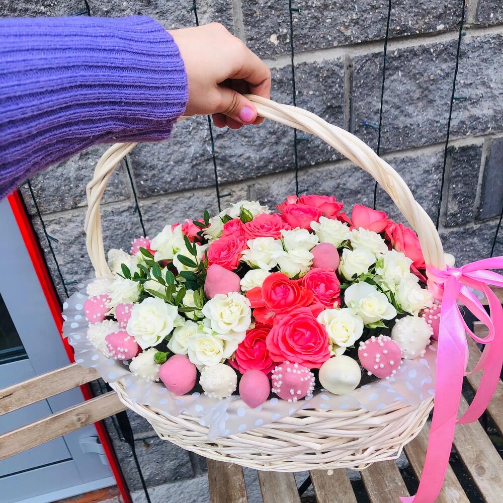Корзина – 1 шт.Клубника – 1000 гр.Роза кустовая – 5 шт.Зелень – 1 шт.