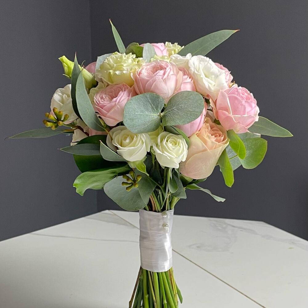 Свадебный букет + бутоньерка, оформленные в атласную ленту.Цветы заказываются индивидуально под каждый букет, поэтому заказ лучше делать минимум за 10 дней до торжества
