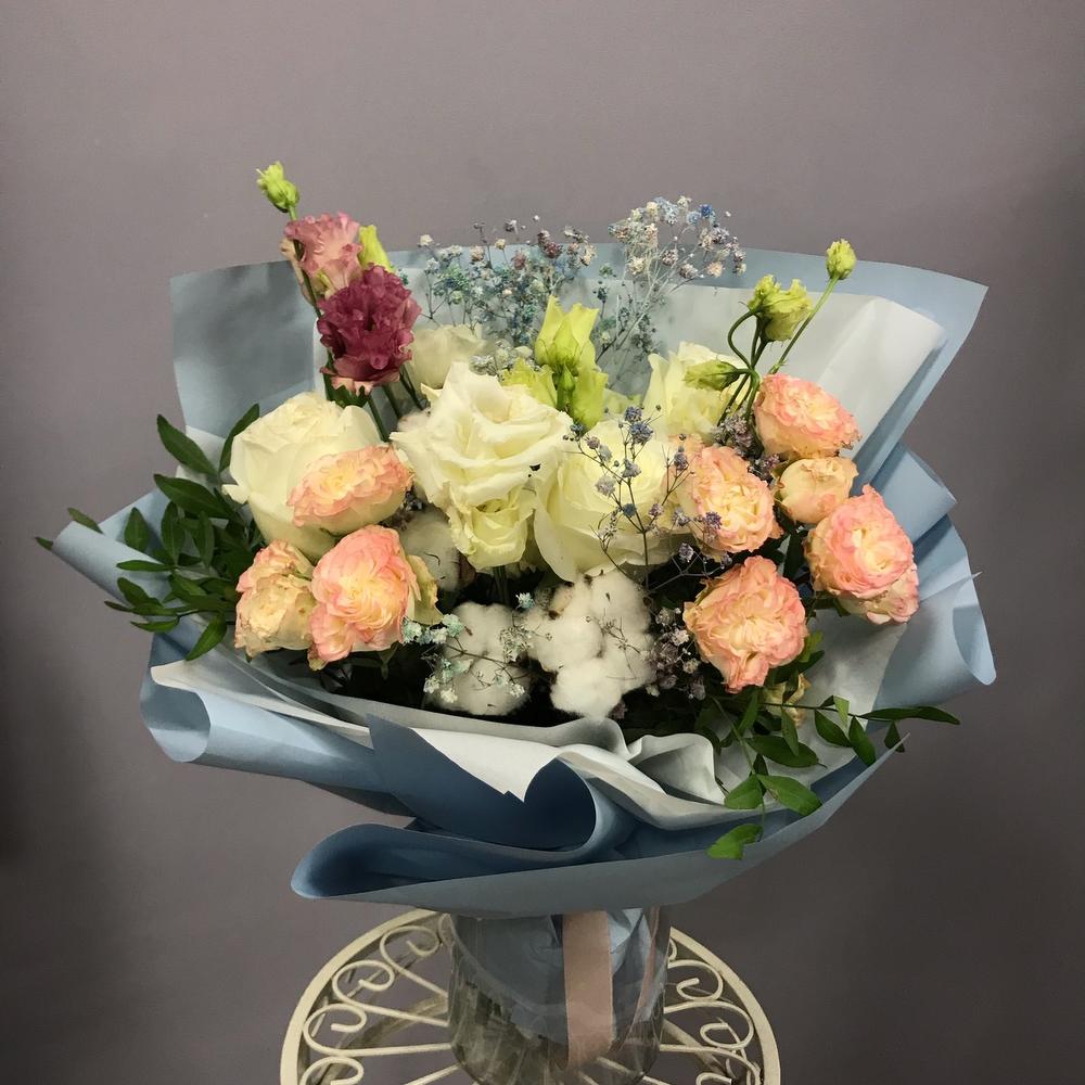 Кружевные розы, легкие шарики гипсофилв и нежные коробочки хлопка, соединились в одну нежную картину – легкую и шелковистую! Такой букет расскажет о Ваших нежных чувствах.