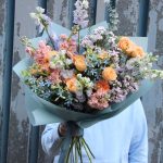 Авторский букет с пионовидными розами, маттиолой, ваксфлауэром и твидией.