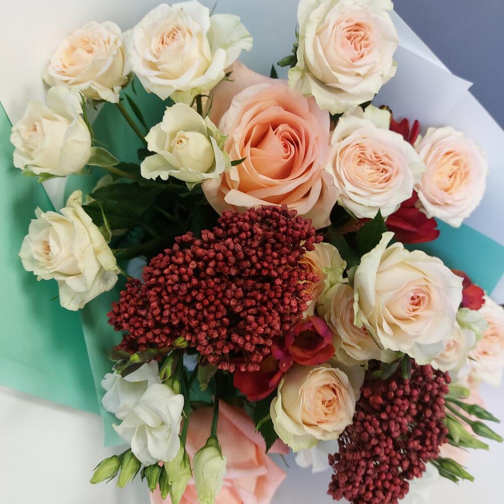 Роза Эквадор 60 см – 3 шт.Лизиантус – 2 шт.Роза кустовая – 2 шт.Озотамнус – 2 шт.Фрезия – 3 шт.Упаковка дизайнерская – 3 шт.Лента атласная – 2 шт.