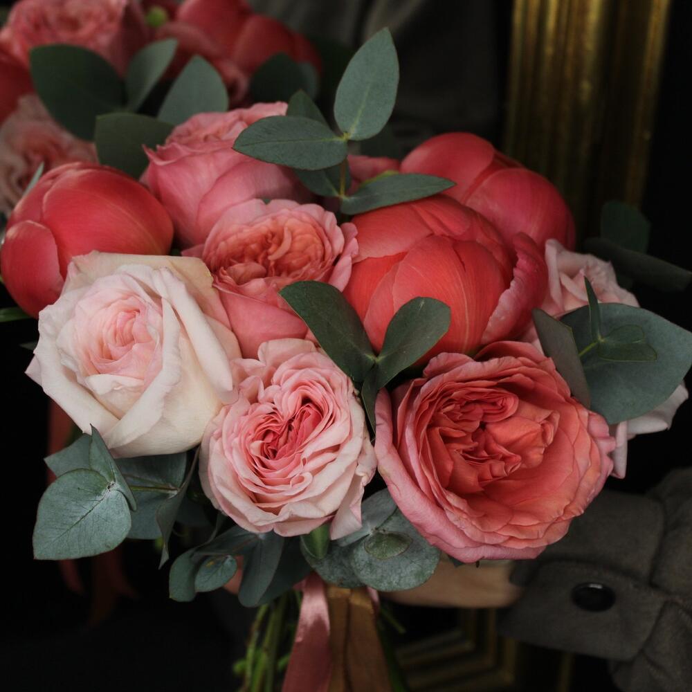Пион коралл шарм – 3 шт.роза пинк охара(ароматная) – 3 шт.роза пионовидная пинк экспрешн – 4 шт.Лента атласная – 2 шт.Эвкалипт – 3 шт.