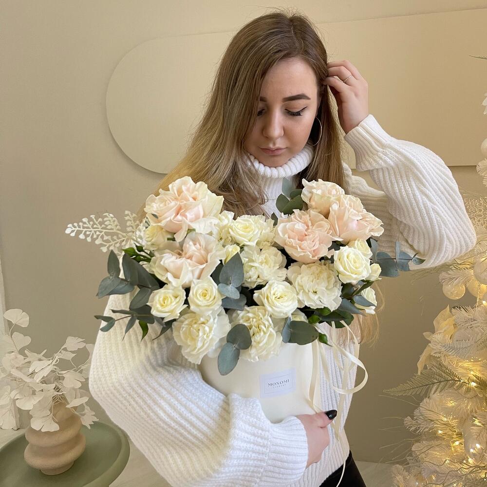 Роза кустовая – 3 шт.Эвкалипт – 7 шт.Роза – 5 шт.Лента атласная – 1 шт.Диантус – 6 шт.Фисташка – 3 шт.Шляпная коробка – 1 шт.Оазис флористический – 1 шт.наклейка фирменная – 1 шт.