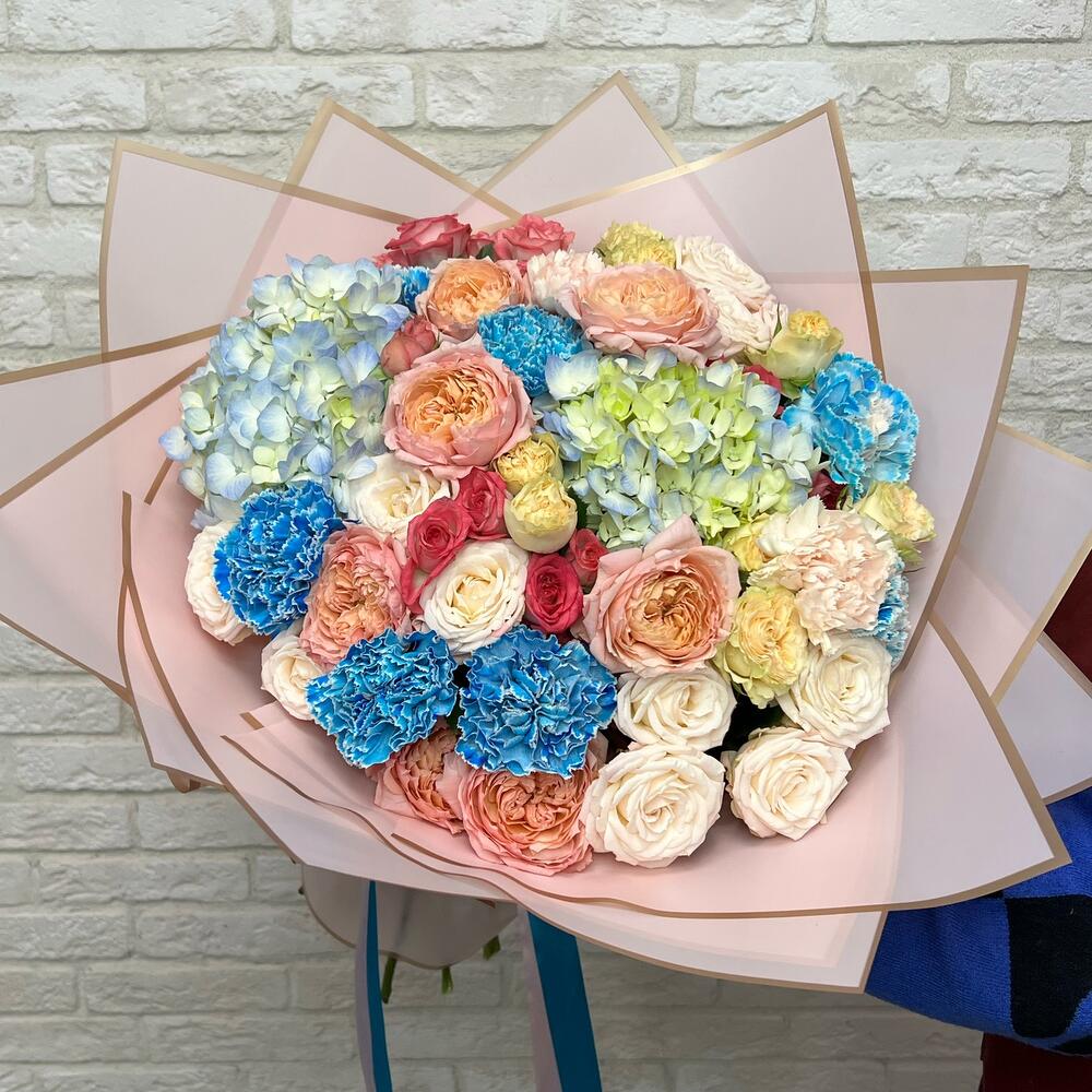 Гортензия – 2 шт.Диантус – 7 шт.Роза кустовая пионовидная – 7 шт.Упаковка дизайнерская – 1 шт.