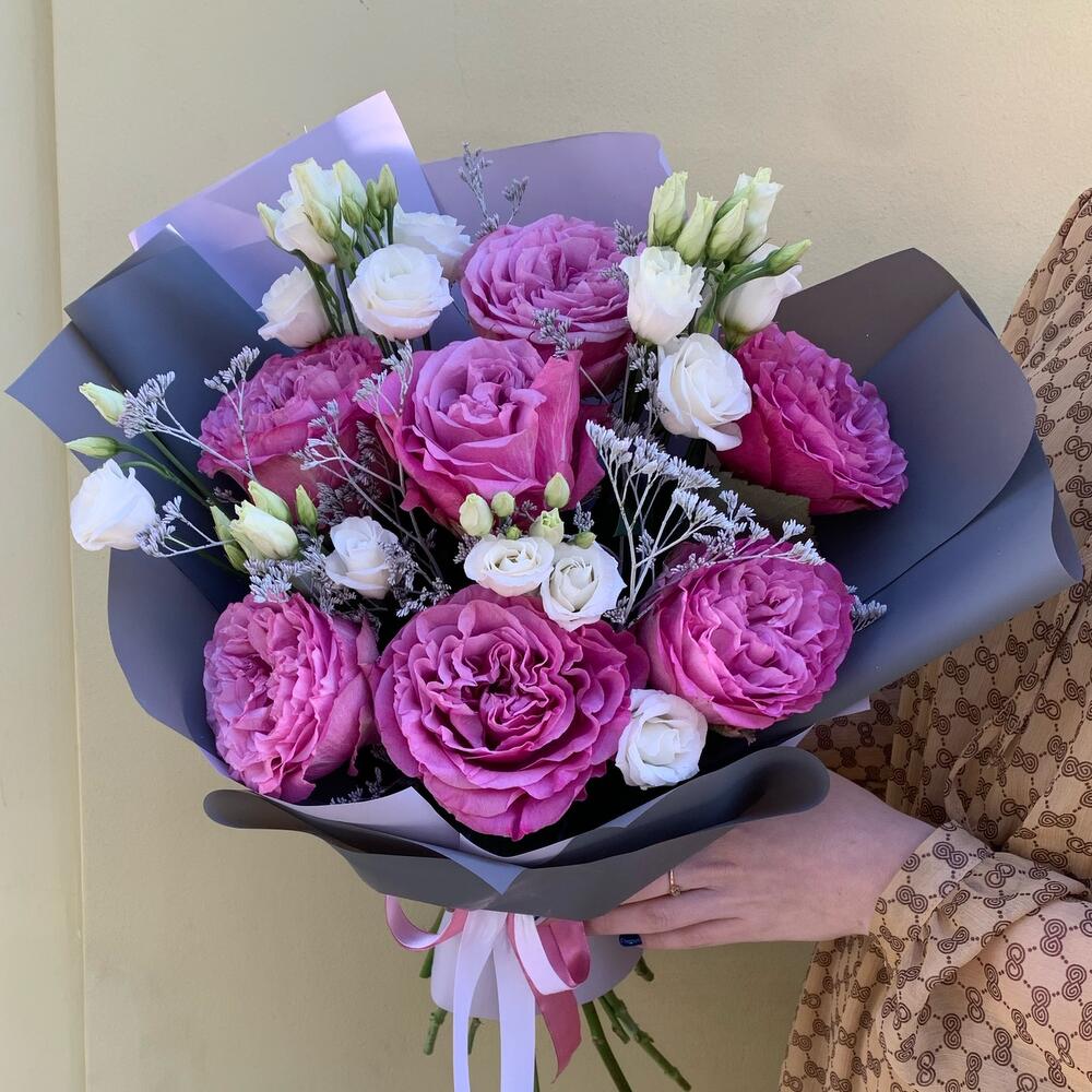Лимониум – 3 шт.Роза одноголовая – 7 шт.Эустома – 2 шт.Лента атласная – 2 шт.Упаковка дизайнерская – 3 шт.краска флористическая – 1 шт.