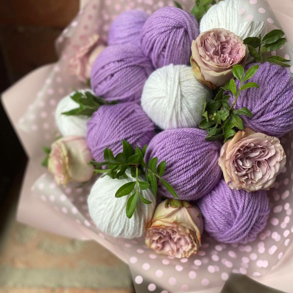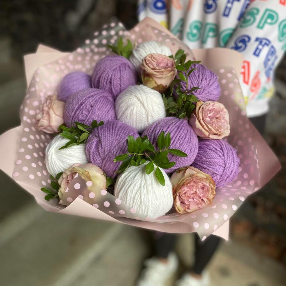Зимний букет из клубков пряжи, роз и зелени в стильной упаковке “Альпака”