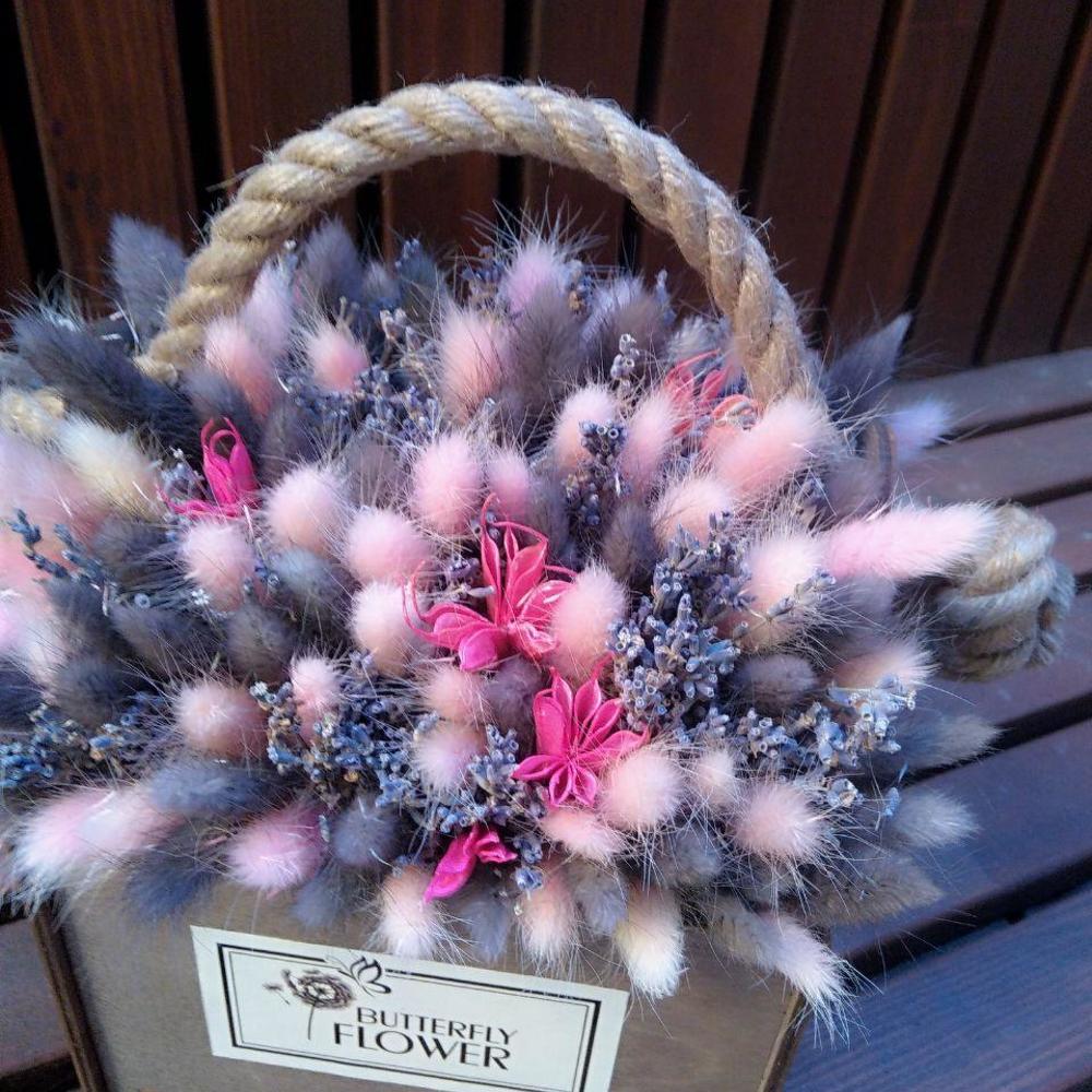 Ящик деревянный – 1 шт.Оазис для сухоцветов – 1 шт.Лаванда (сухоцвет) пучок – 1 шт.лагурус (сухоцвет) пучок – 1 шт.Нигелла сухоцвет – 4 шт.Статица – 5 шт.