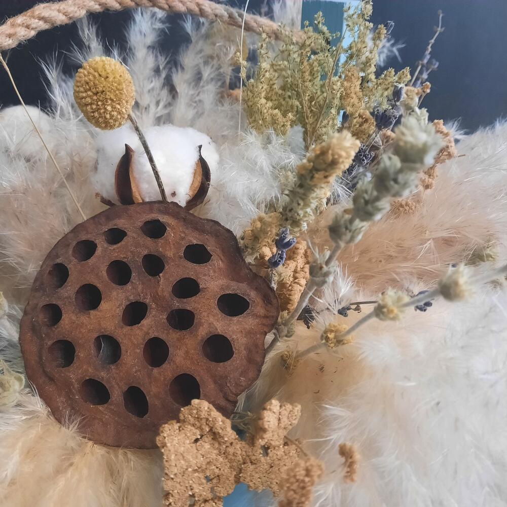 Лаванда – 15 шт.Пшеница – 5 шт.Ящик деревянный – 1 шт.Лагурус – 3 шт.Лотос сухой – 2 шт.Оазис флористический – 1 шт.Клевер – 3 шт.кортадерия – 1 шт.