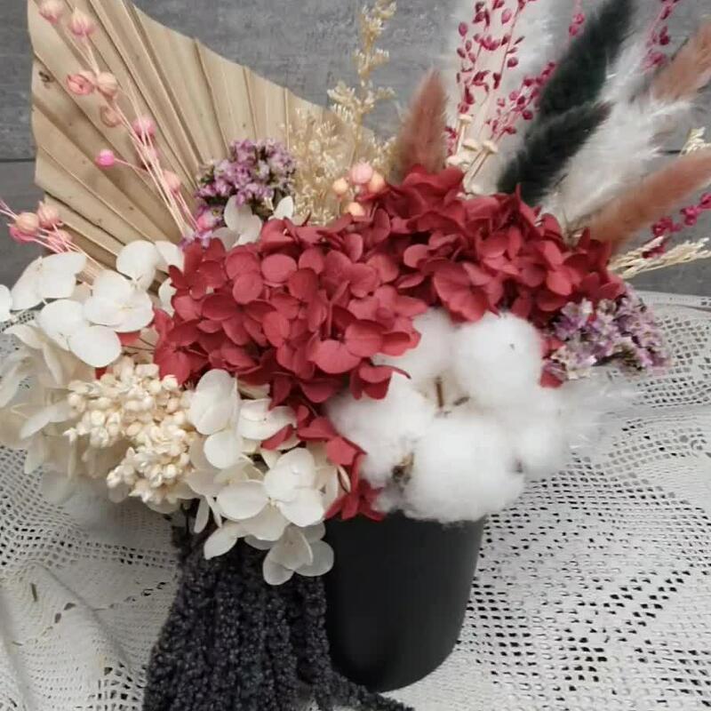 гортензия стабилизированная пучок – 2 шт.мини пампас – 2 шт.Лагурус (сухоцвет) – 5 шт.бриза пучок – 1 шт.Лен – 3 шт.амарант стабилизированный – 1 шт.копье пальмы – 1 шт.сорго – 1 шт.статица стабилизированная – 2 шт.Кермек – 2 шт.Хлопок натуральный – 1 шт.ботао – 6 шт.Кашпо керамическое – 1 шт.