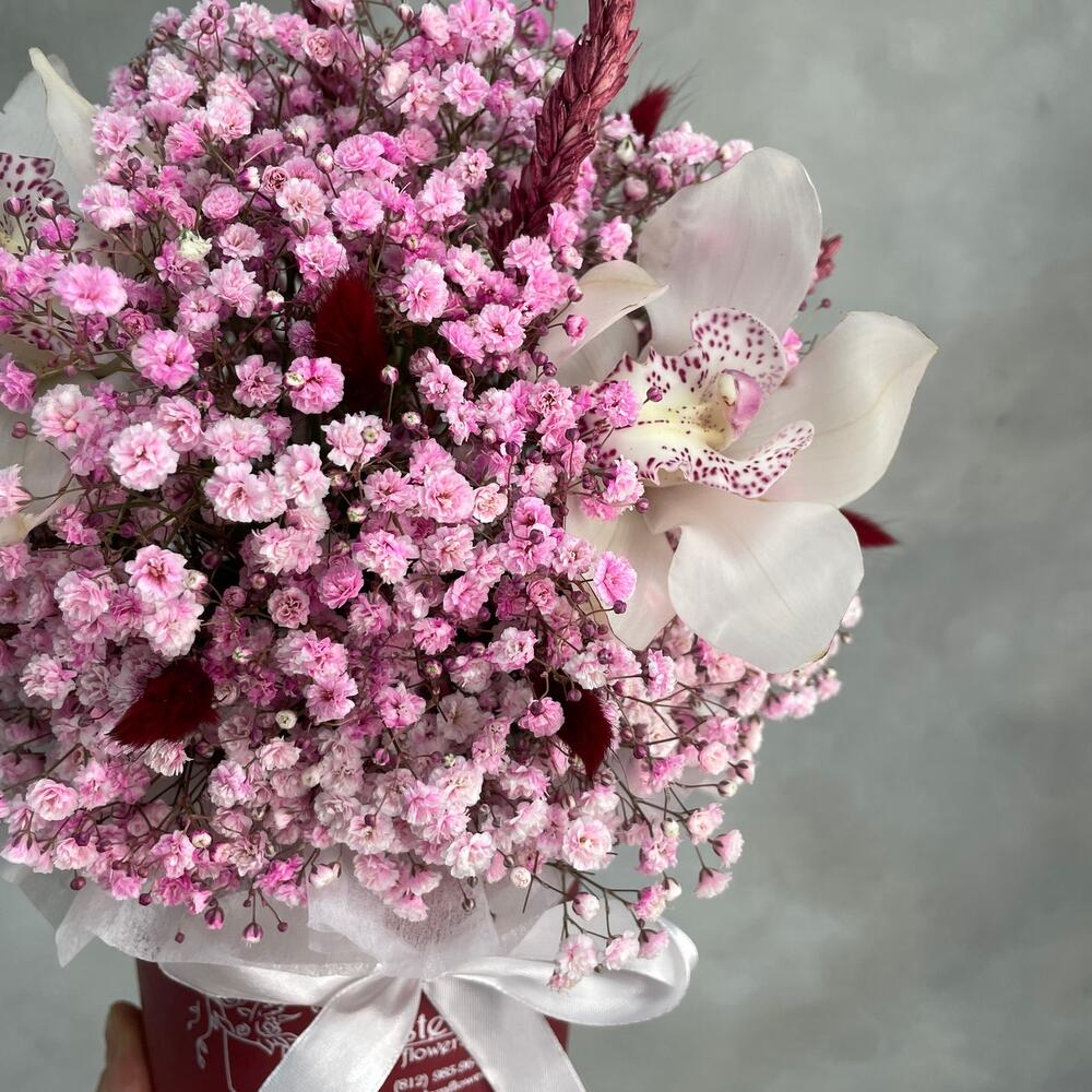 Орхидея Цимбидиум – 3 шт.Оазис – 1 шт.Лагурус – 11 шт.Коробка d12 – 1 шт.Гипсофила розовая – 7 шт.