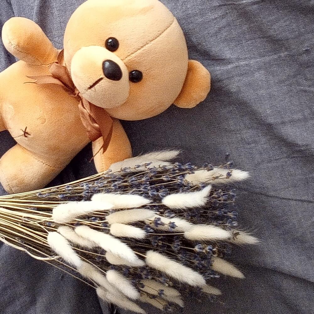 мишка плюшевый 23 см – 1 шт.Лаванда (сухоцвет) – 85 шт.Лагурус (сухоцвет) – 11 шт.Лента атласная – 1 шт.