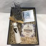 Подарочный набор с ароматной лавандой вместе с полезным шоколадом с черникой. А для коллекционеров: фарфоровая фигурка зайца с гнущимися ушками. Идеальный подарок.
