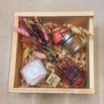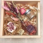 Ящик деревянный – 1 шт.Ваза стекло – 1 шт.букет сухоцветов – 1 шт.свеча банка home – 1 шт.бомбочка из натуральных масел для ванной – 1 шт.конфеты счастье – 2 шт.подарочный сертификат на 5000 ( цветы и подарки сети флора point) – 1 шт.